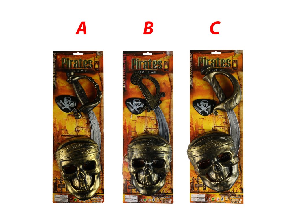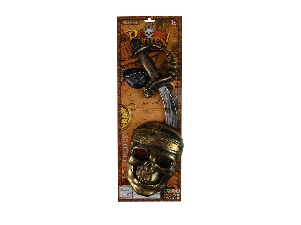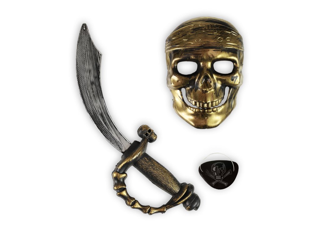 Exkluzivní sada pro všechny malé piráty! Tento parádní set obsahuje bronzovou masku na gumičku, klapku na oko a meč s bronzovou rukojetí. Tyto super doplňky jsou ideální k pirátskému kostýmu! Vše je vyrobeno z PVC.