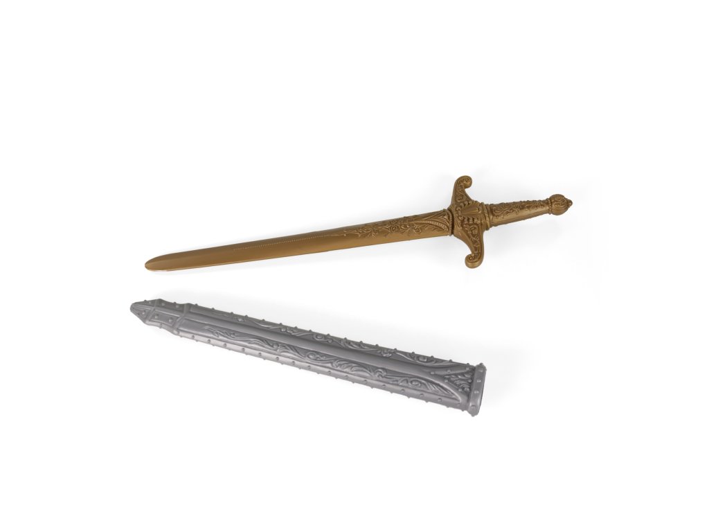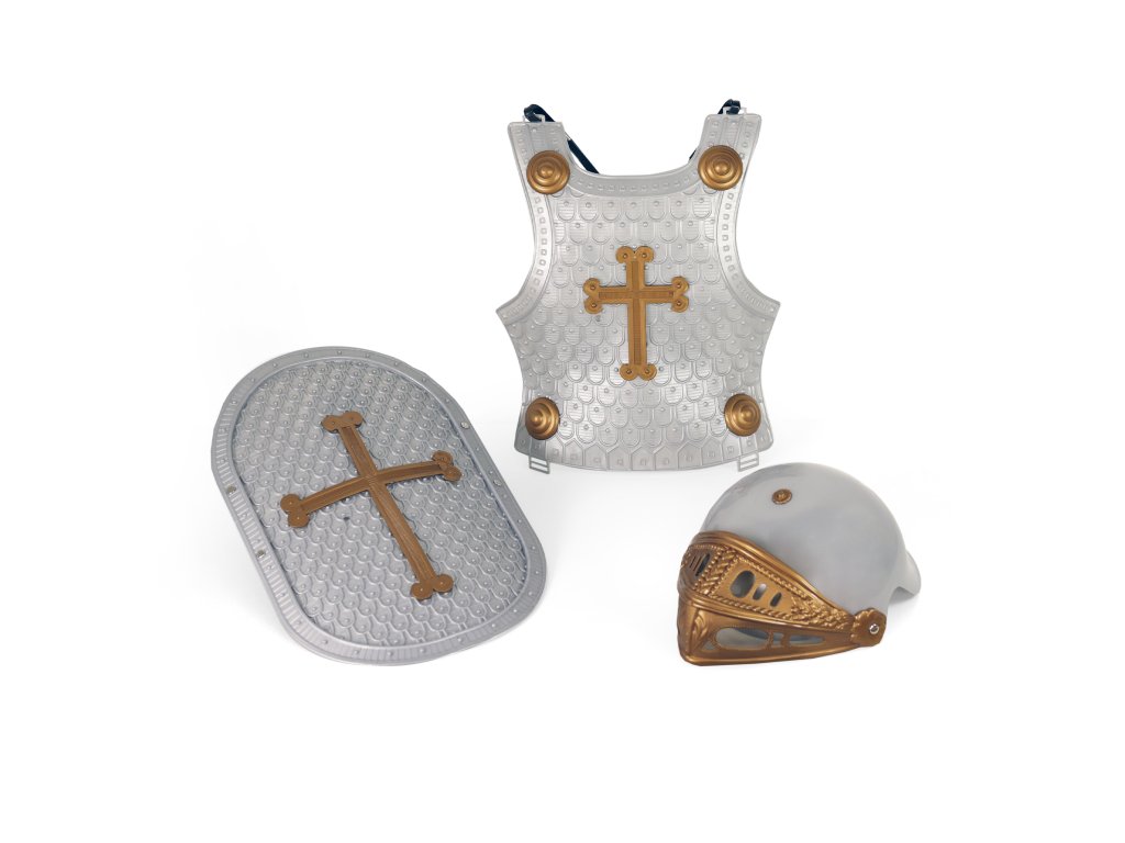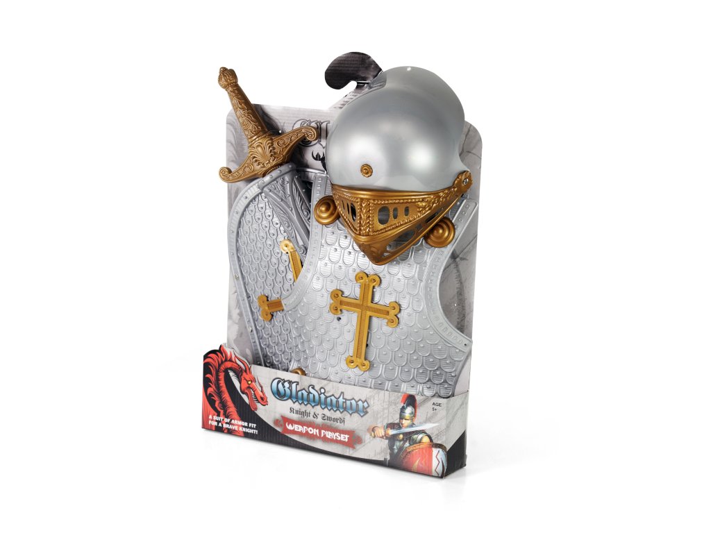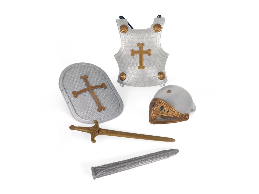 Exkluzivní sada pro opravdové rytíře! Balení obsahuje bronzový meč ve stříbrné pochvě, ochranný štít, helmu s nastavitelným krytem a rytířskou vestu. Vše je vyrobeno z PVC. Staň se opravdovým rytířem díky těmto doplňkům! Obvod helmy je cca 54 cm.