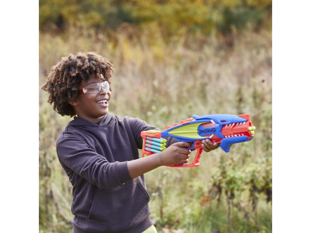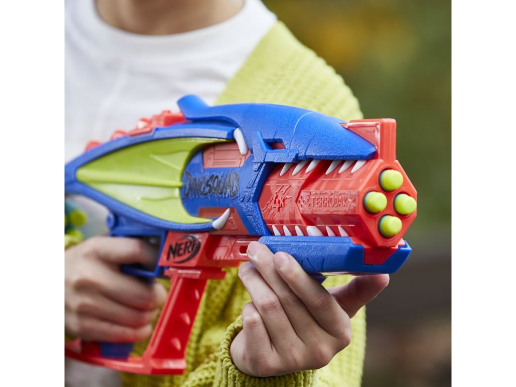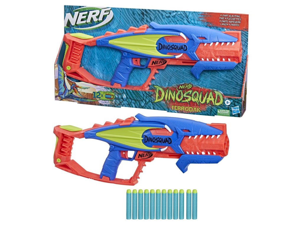 Spojte se s legendárními dinosaury jako člen elitní party DinoSquad! Využijte mimořádnou sílu největších dinosaurů ze všech a vyrazte do úžasných dobrodružství a venkovních her! Děti jsou připraveny na venkovní hry s blástrem Nerf DinoSquad Terrodak, který se vyznačuje úžasným dinosauřím designem a představuje vzhled pterodaktyla. Pěnový blástr má hlaveň, která pojme 4 šipky a vystřeluje je po jedné. Obsahuje 12 pěnových šipek Nerf Elite, takže je k dispozici dostatek šipek pro plné nabití blástru a 8 dalších šipek pro opětovné nabití. A nabíjení je rychlé, protože v blástru je zásobník na 8 šipek. Snadné použití umožňuje dětem hrát si venku! Nabijte 4 šipky do hlavně, zatáhněte závěr dozadu a zatlačte jej dopředu a stisknutím spouště vystřelte 1 šipku. Skvělá venkovní hračka pro kluky i holky!
