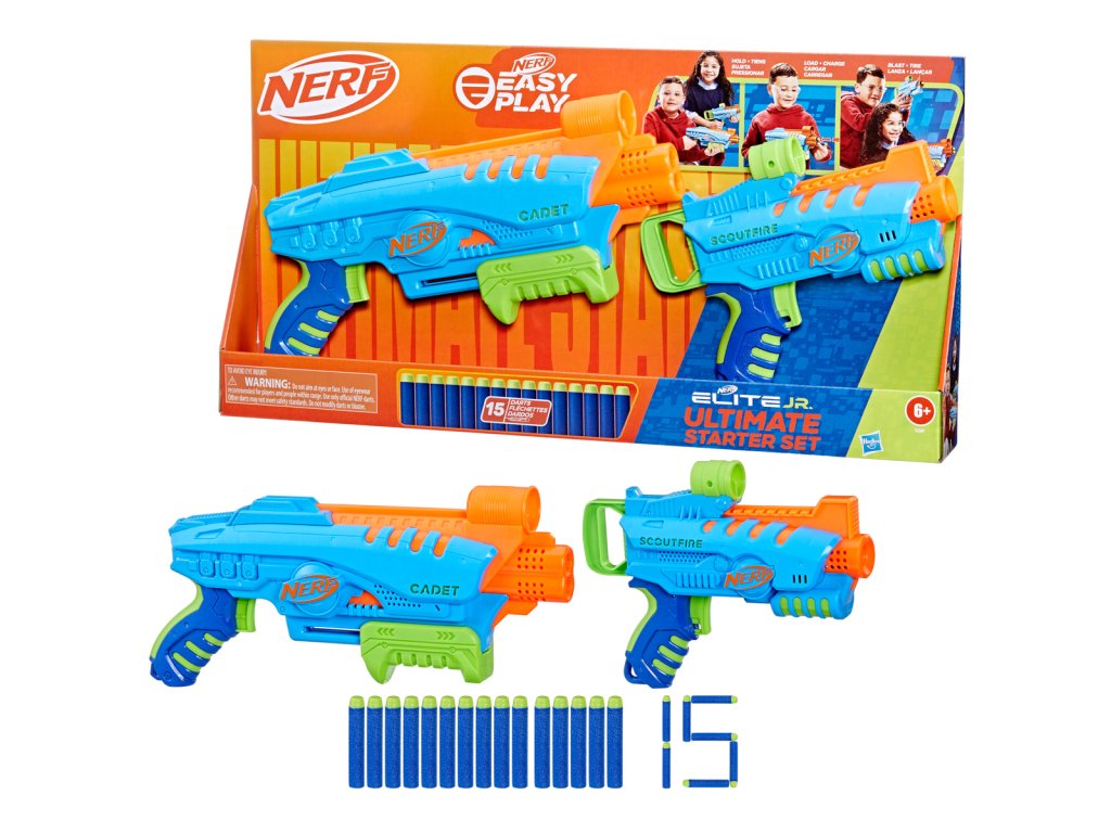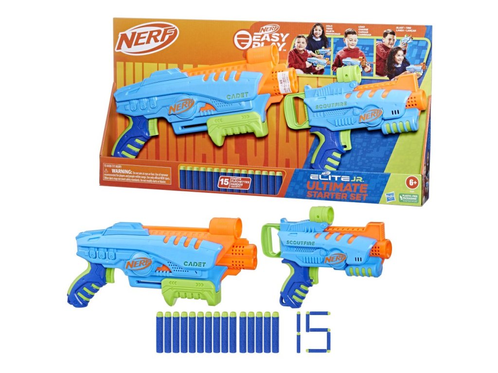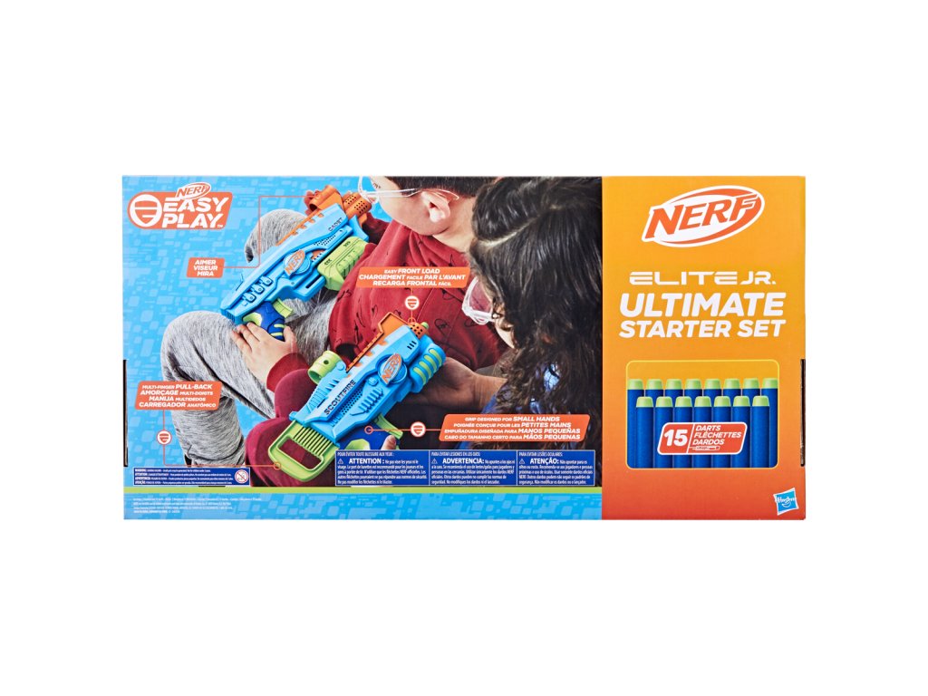 Snadno použitelné pěnové blástry Nerf Elite Jr jsou určeny pro chlapce a dívky, kteří se poprvé pouštějí do bitev Nerf. Díky speciálním funkcím se s nimi snadno hraje, takže děti budou hrát vzrušující hry s hračkami Nerf během okamžiku. Mohou se pustit do energií nabité hry se šipkami uvnitř i venku a zažít vzrušení z toho, že to všechno dělají samy. Blástry se snadno drží, mají takovou velikost, aby se pohodlně vešly do malých rukou, a jsou lehké pro snadné přenášení při dětských venkovních hrách. Konstrukce s předním plněním usnadňuje vkládání šipek. Střílení je usnadněno rukojetí mající nejnižší tažnou sílu ze všech šipkových blástrů Nerf. Všechny tyto funkce umožňují dětem dostat se do rychlé akce a mohou ukázat své střelecké dovednosti, protože každý krok dělají samy! Snadno použitelná sada Nerf Elite Junior Ultimate obsahuje 2 blástry na pěnové šipky, 2 terče a 15 pěnových šipek Nerf Elite.