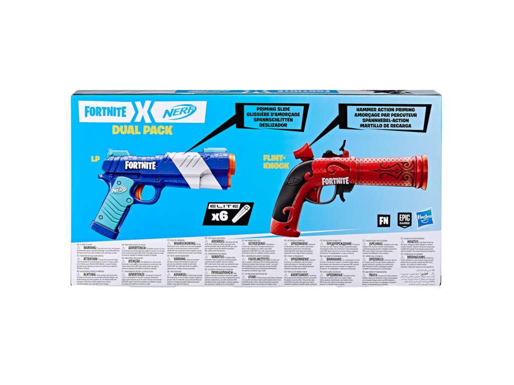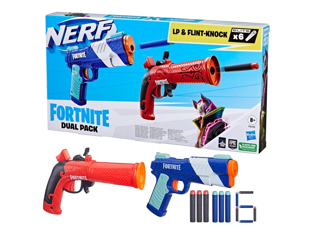 Tento úžasný balíček Nerf Fortnite Dual Pack obsahuje 2 pušky Nerf Fortnite a 6 pěnových šipek Nerf Elite! S tímto speciálním multipackem jste připraveni vyrazit do terénu. Obě pušky na šipky jsou inspirovány vybavením používaným ve Fortnite a jsou v této sadě dostupné poprvé. Puška Flint-Knock je vybavena aktivací úderníku a vystřeluje 1 šipku. Nízkotlaká puška má tahový náboj a vystřeluje 1 šipku. Obě pušky Nerf se snadno používají a jsou připraveny k použití ve 3 jednoduchých krocích. Nabijte zepředu 1 šipku, naplňte a stiskněte spoušť. Obsahuje 6 oficiálních elitních pěnových šipek Nerf, které vám poskytnou další šipky pro opětovné nabití.
