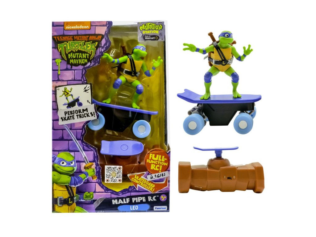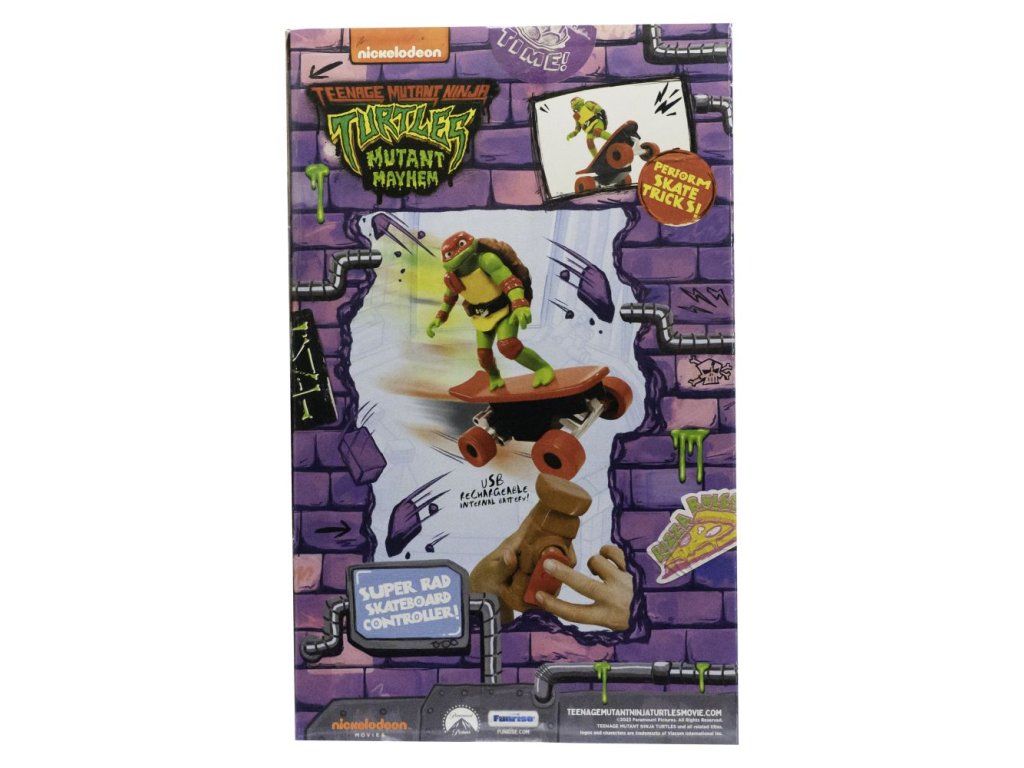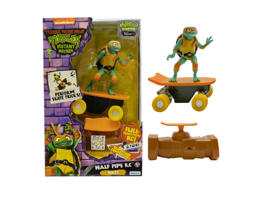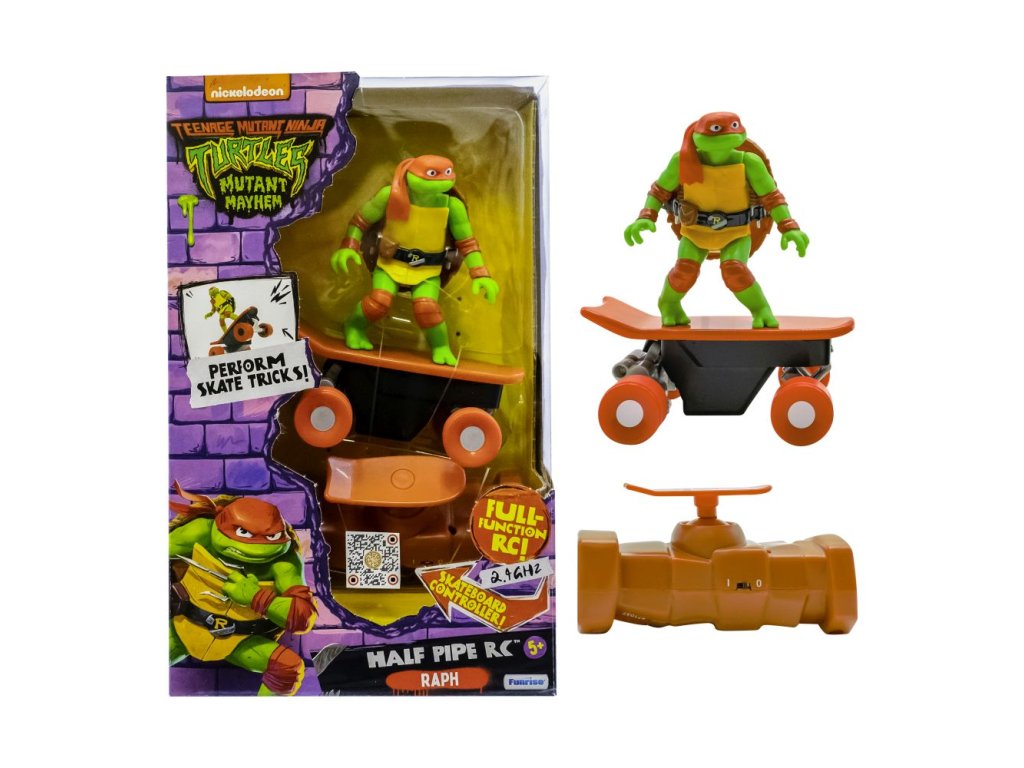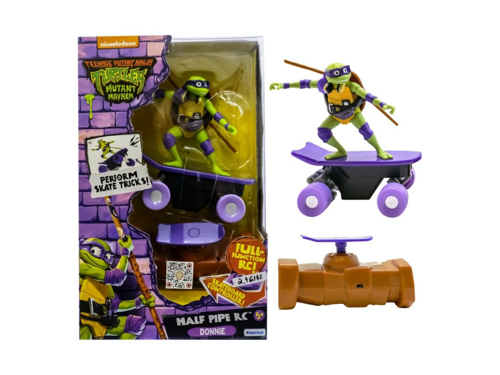 RC želvy na skatech jsou plně funkční 2,4 GHz dálkově ovládané skateboardy, které napodobují realistické manévry. Jedinečný ovladač ve tvaru skateboardu usnadňuje přidávání rychlosti, řazení a trhání na jakémkoliv povrchu. Nasbírejte všechny 4 druhy! Vhodné pro děti od 4 let.