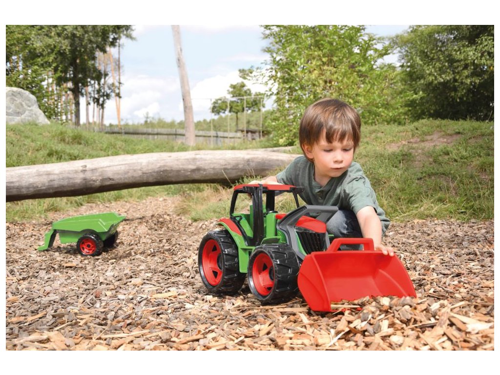 Kvalitně zpracovaný traktor s nakládací lžíci a přívěsem byl navrhnut a vyroben tak, aby odpovídal požadovanému modernímu vzhledu, funkčnosti, odolnosti, kvalitnímu zpracování, maximální hrací hodnotě.