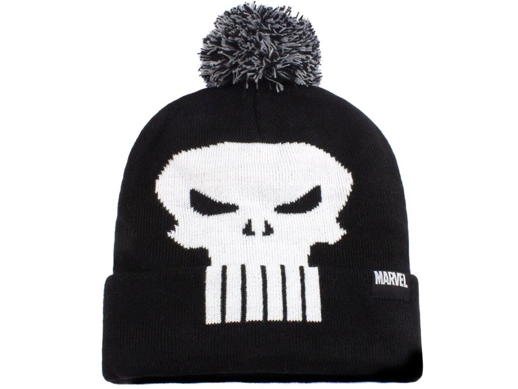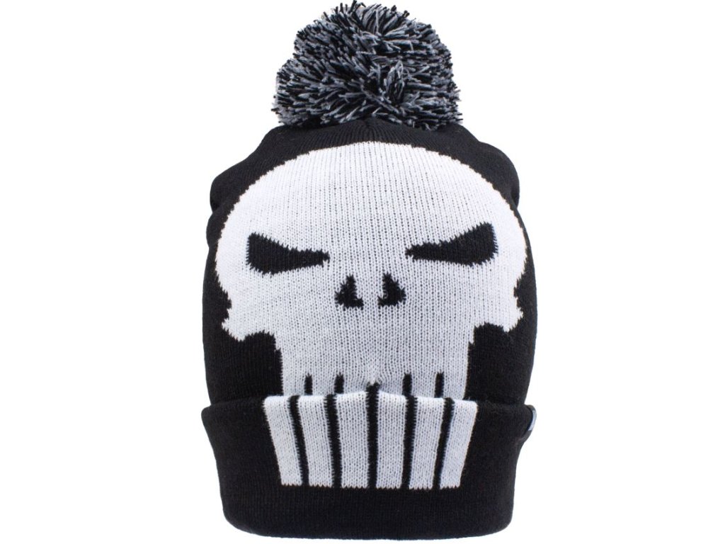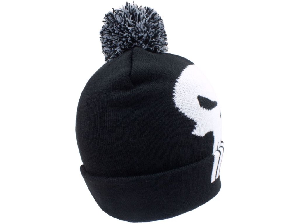 Černá atraktivní čepice s bambulí a motivem Punisher.
