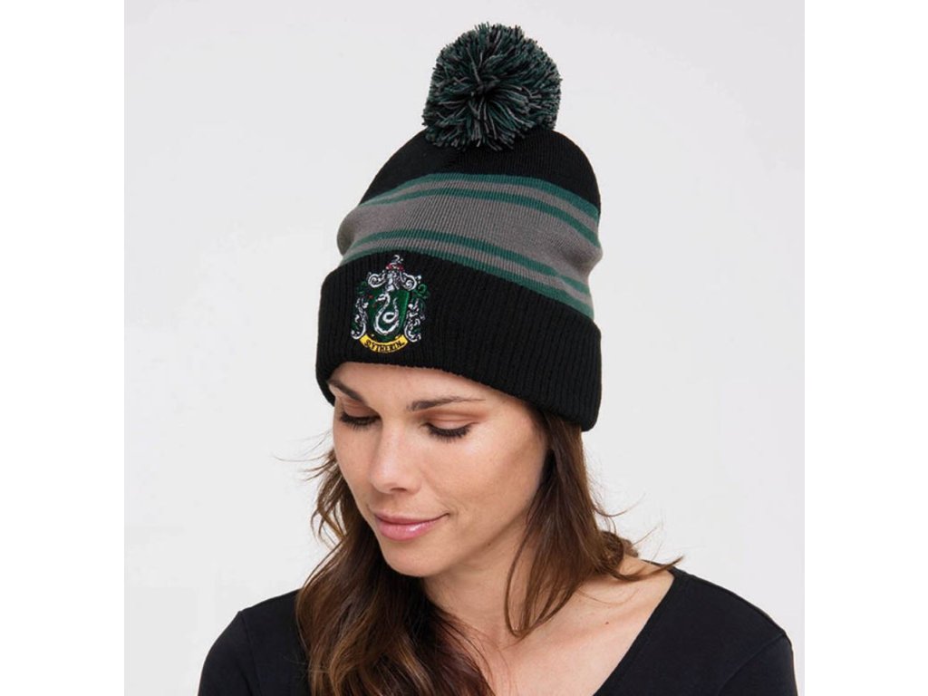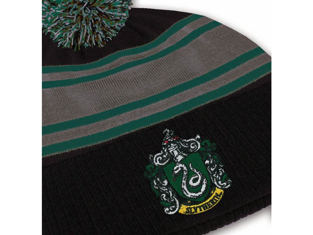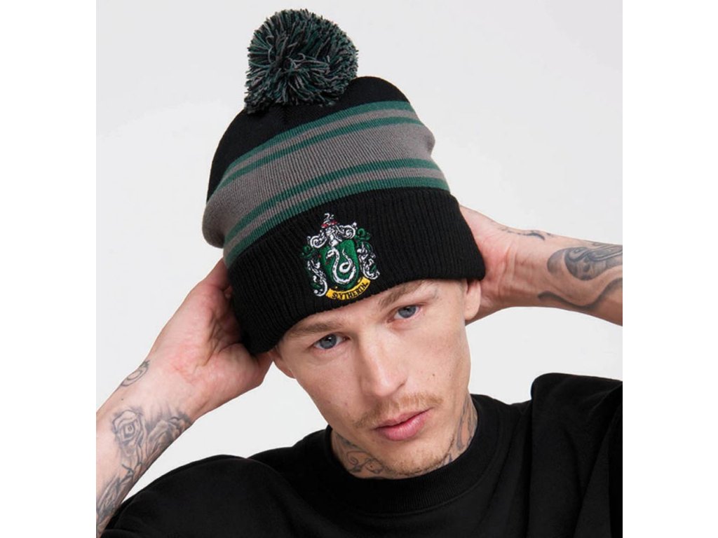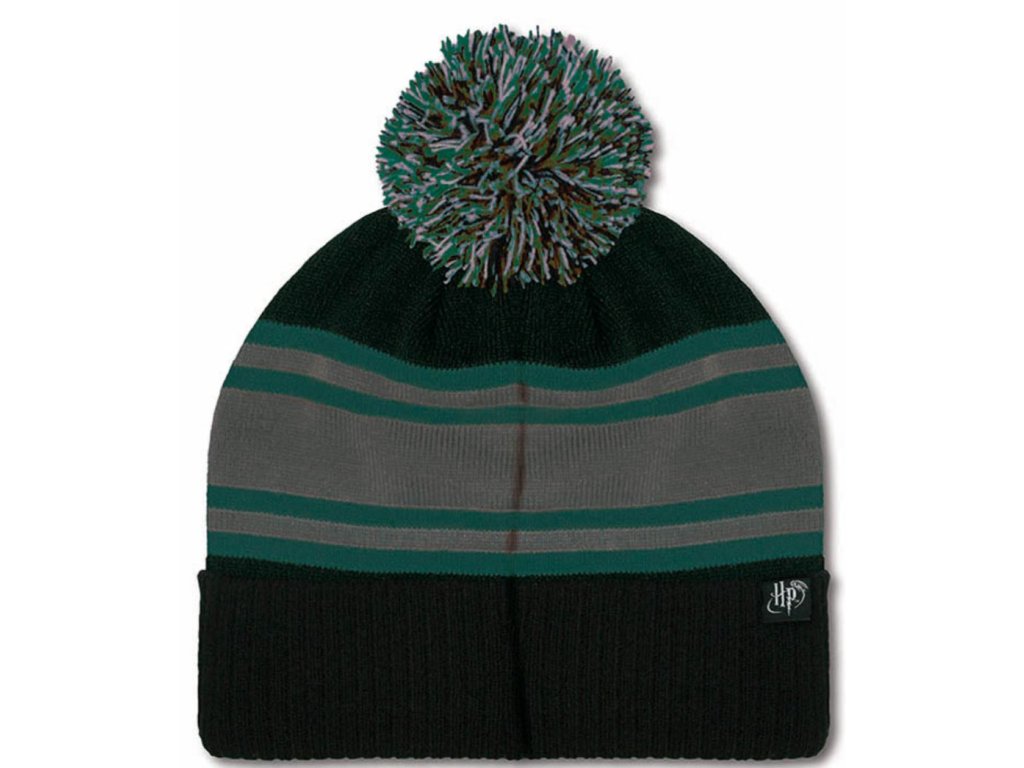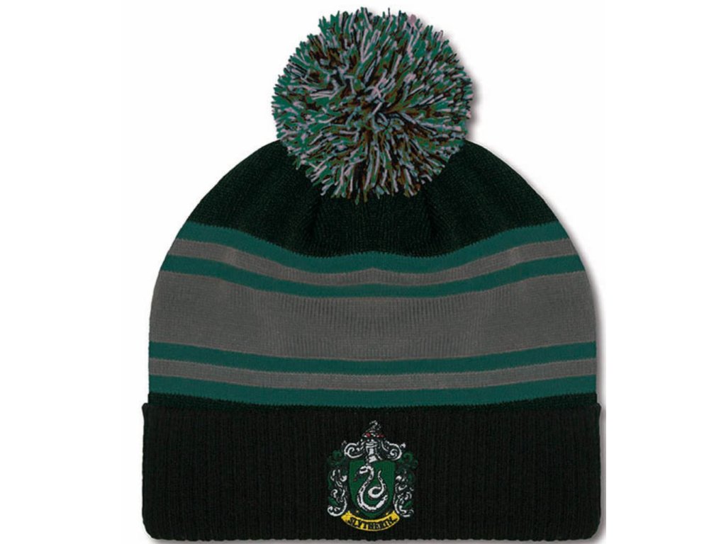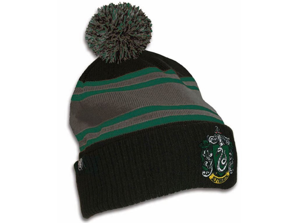 Černá zimní čepice s bambulkou a se znakem koleje Slytherin (Zmijozel) z filmové a knižní ságy Harryho Pottera.