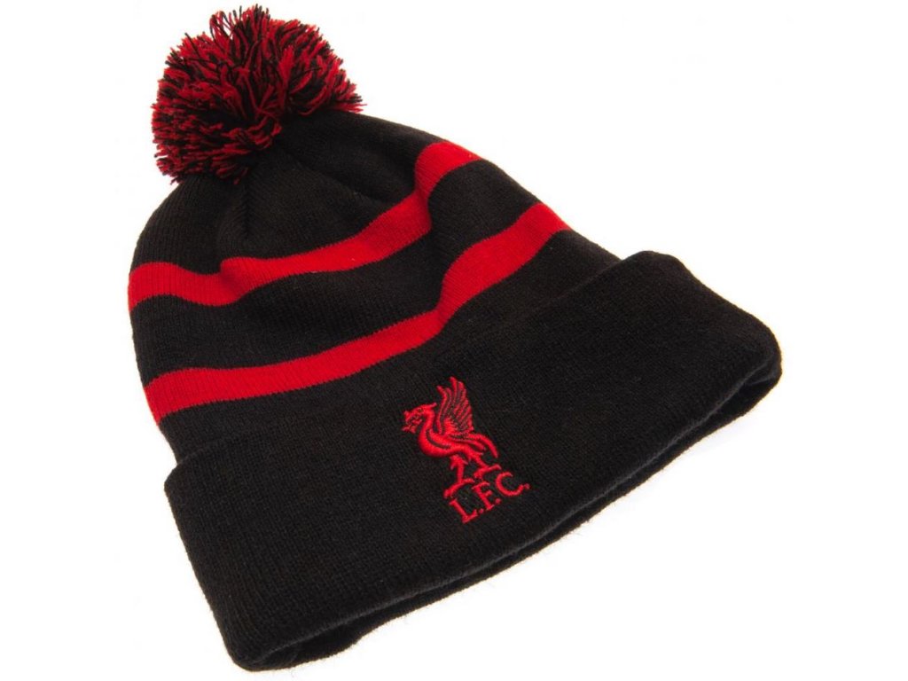Černá zimní čepice s červenými pruhy, červenočernou bambulí a výrazným znakem fotbalového klubu Liverpool FC na přední straně čepice.