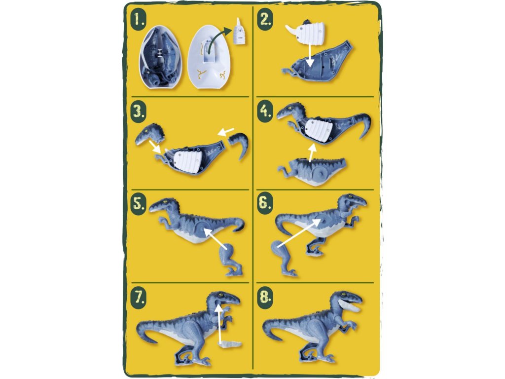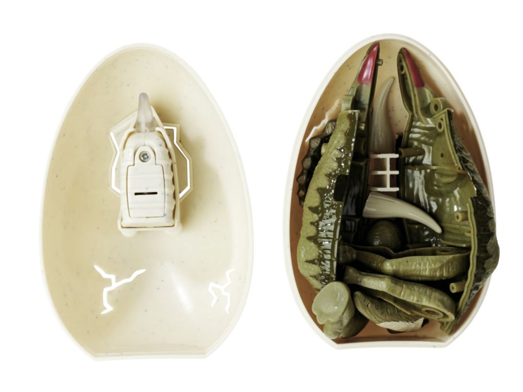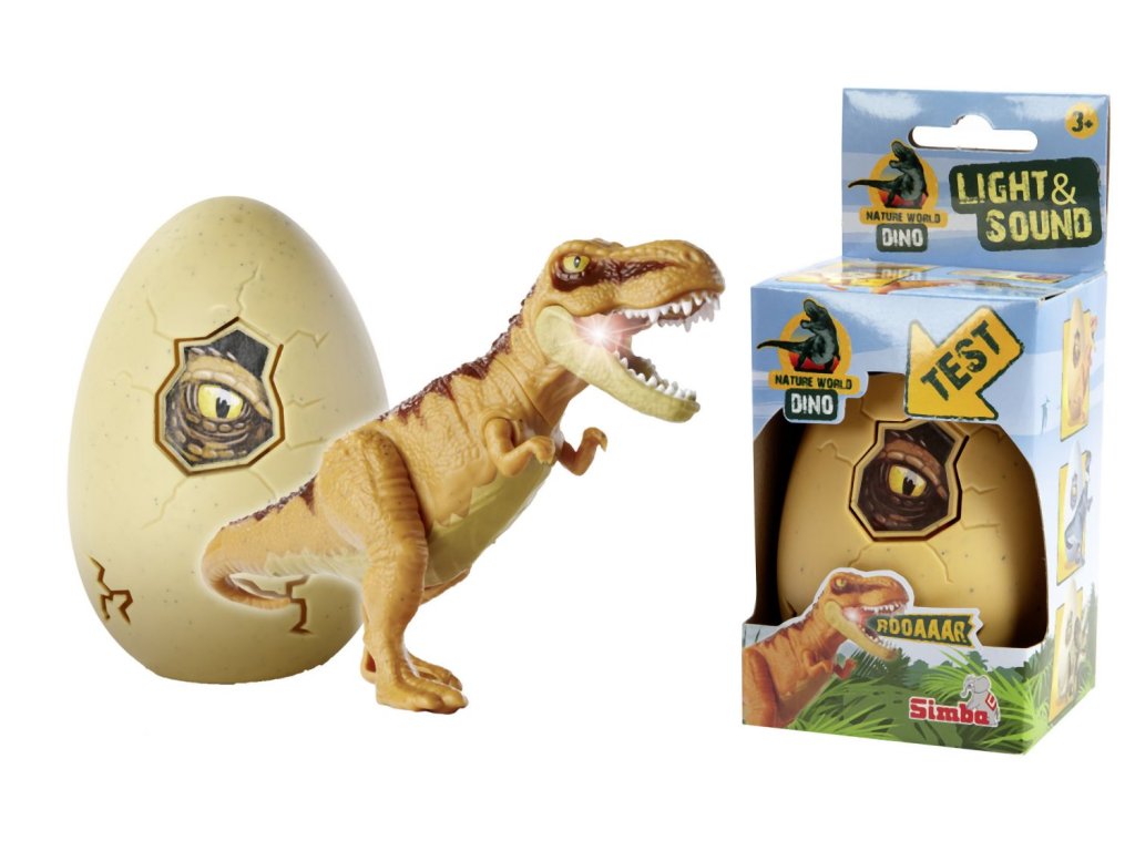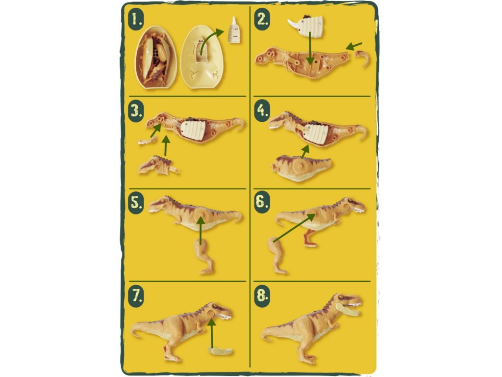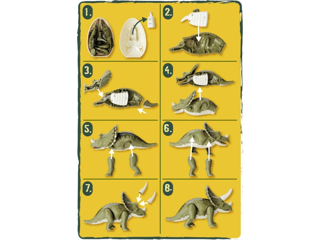 V každém vejci je schována figurka dinosaura o velikosti 14 cm, skládačka kostry dinosaura a návod. Dinosaurus svítí a vydává zvuky, 3 druhy - T-Rex, Velociraptor, Triceratops.