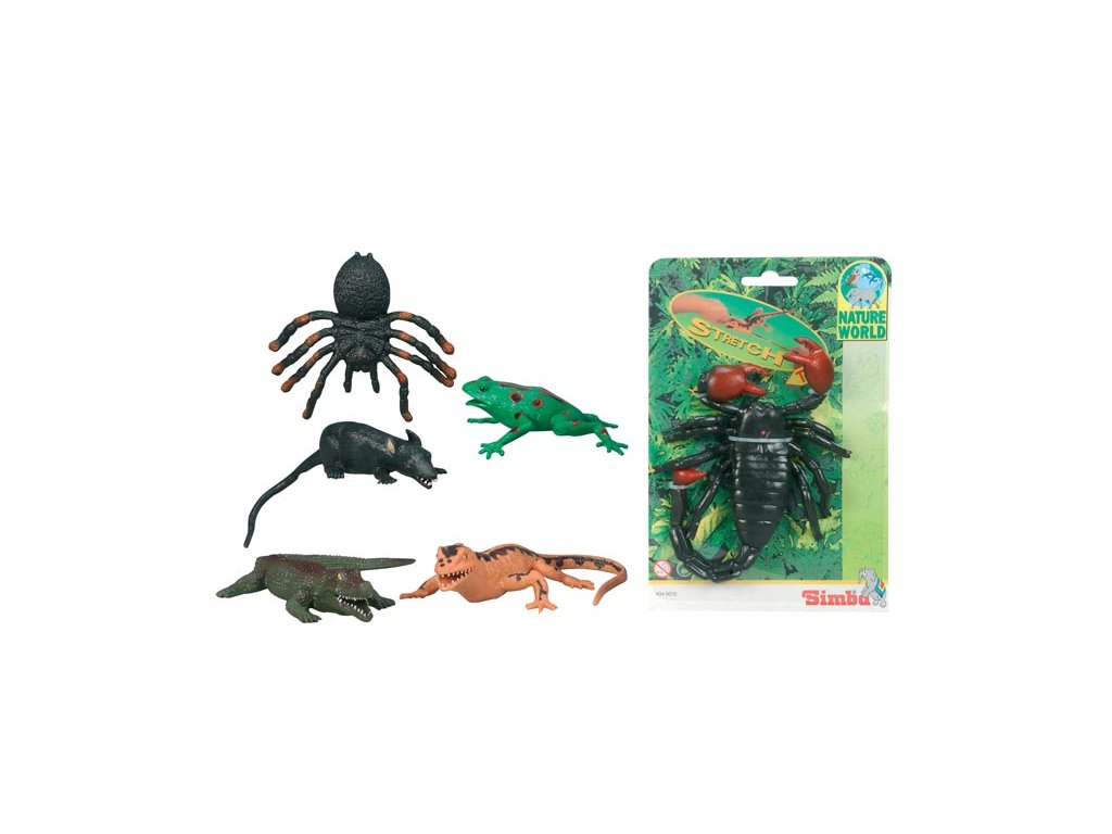Gumová strečová zvířata. Škorpión, pavouk, krysa, krokodýl, ještěrka a žába. Délka: 14 cm.
