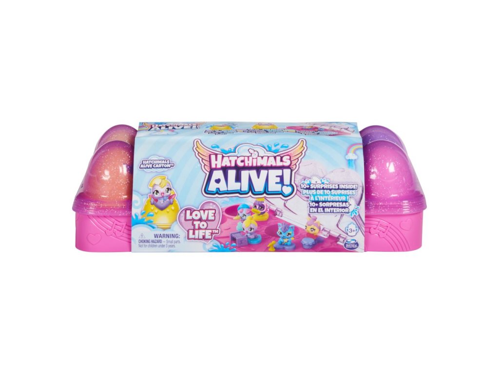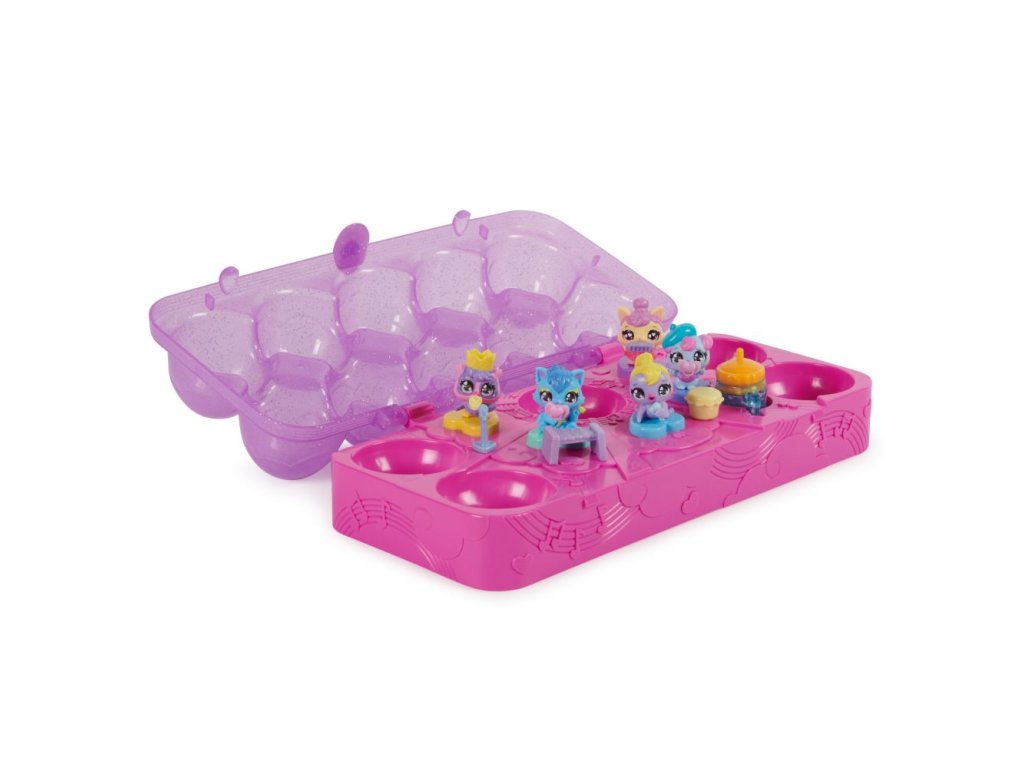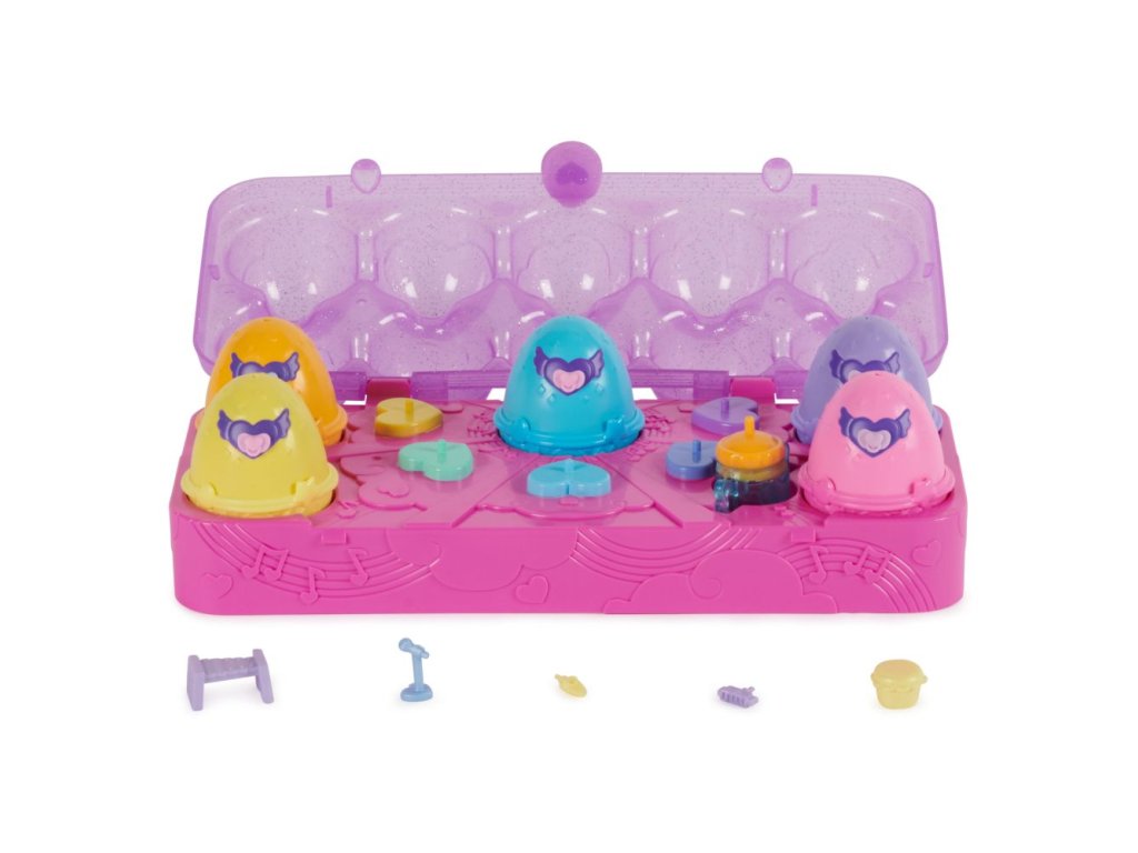 V krabici Hatchimals Alive nastal čas na hudbu! Díky vaší lásce a péči superroztomilé postavičky Hatchimals Alive magicky ožijí zcela novým způsobem. Z vajíčka pro samostatné líhnutí se po aktivaci vodou vylíhnou jako ze skutečných vajec! Stisknutím krabici otevřete a objevte pět barevných vajíček Hatchimals s pěti postavičkami a 11 doplňky! Když chcete zahájit proces líhnutí, vyndejte dudlíky z vajíček, naplňte láhev vodou a vsuňte ji do vajíček. Během několika sekund se vaši hudební kamarádi začnou líhnout a prorazí vajíčko! Vystavte Hatchimals v krabici, abyste si mohli společně zahrát různé melodie, a využijte svou fantazii k vymýšlení hudebních dobrodružství! Doplňky jako mikrofon, bubínek, kazoo a další váš příběh ještě vylepší - dudlíky se navíc vejdou do úst každé postavičky! Zavřete víko a zamkněte krabici, abyste si Hatchimals mohli vzít na cesty. Pro další hry si pořiďte hrací sadu Hatchi-Nursery (prodává se samostatně)! Hračky Hatchimals pro děti se skvěle hodí pro všechny, kdo mají rádi sběratelské předměty, figurky, malé hračky, panenky a domečky pro panenky. Skvělý dárek k narozeninám a Vánocům i při jakékoliv jiné příležitosti pro děti od 3 let. Užijte si doma hudební zábavu s krabicí Hatchimals Alive!