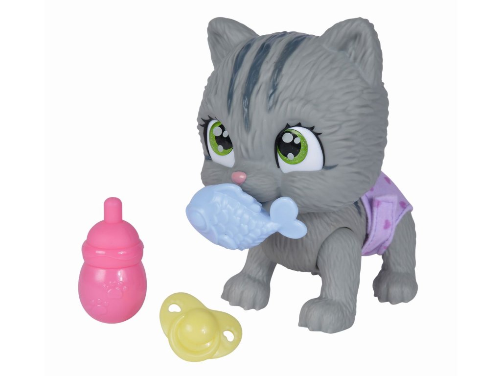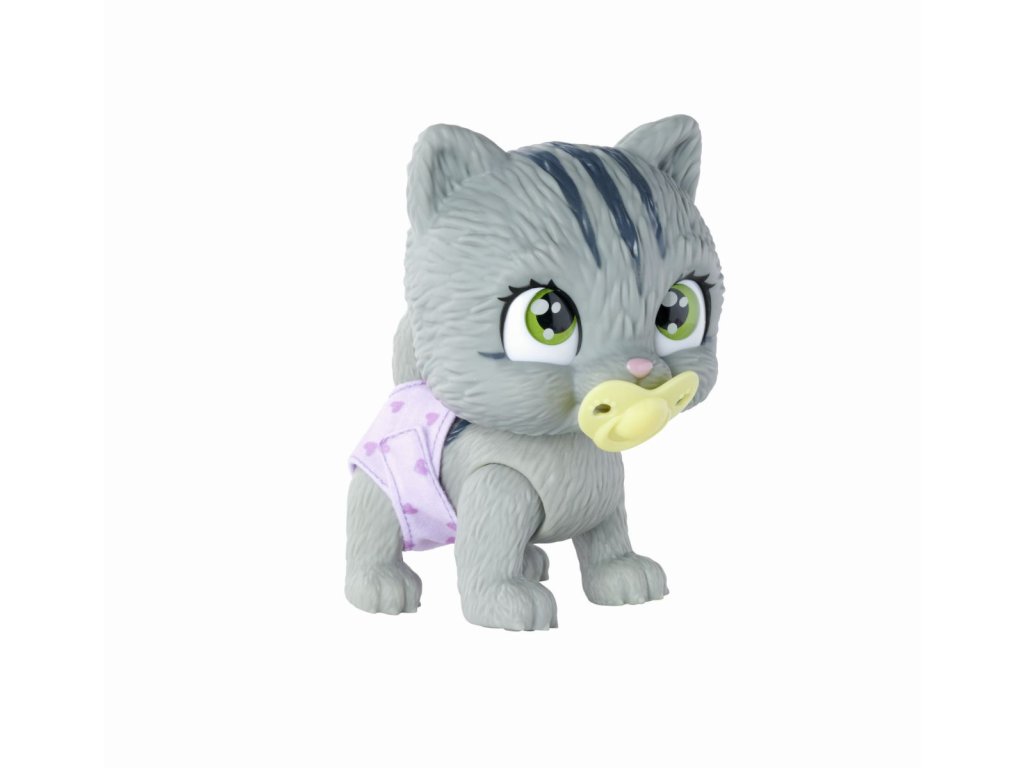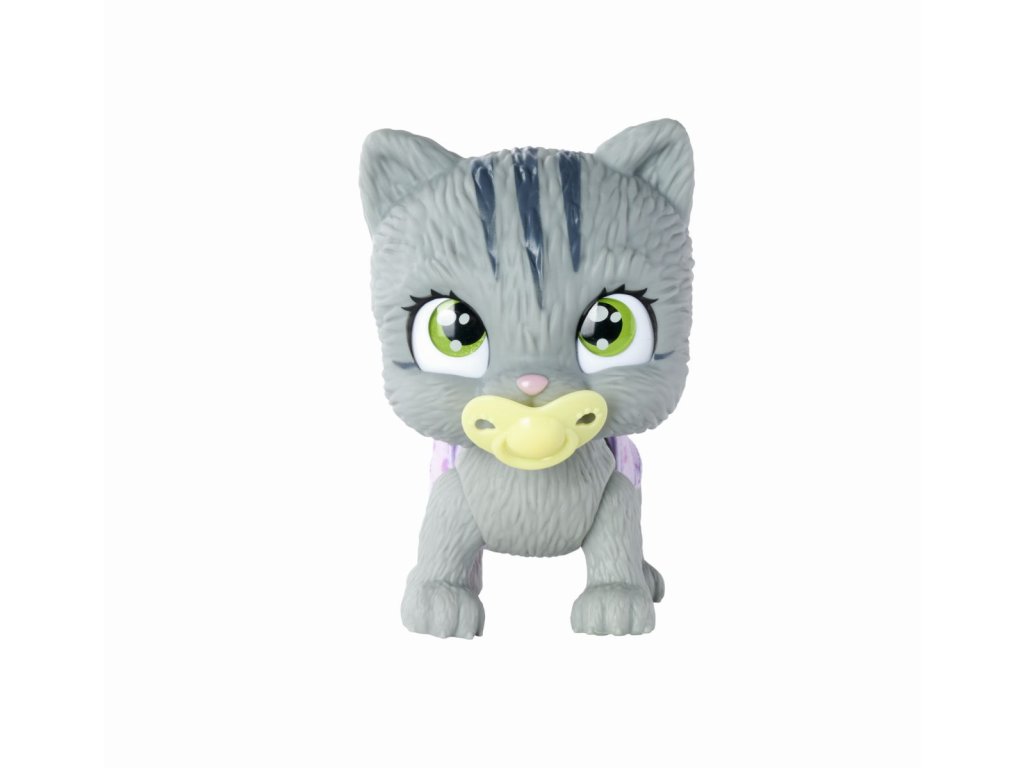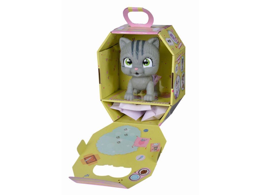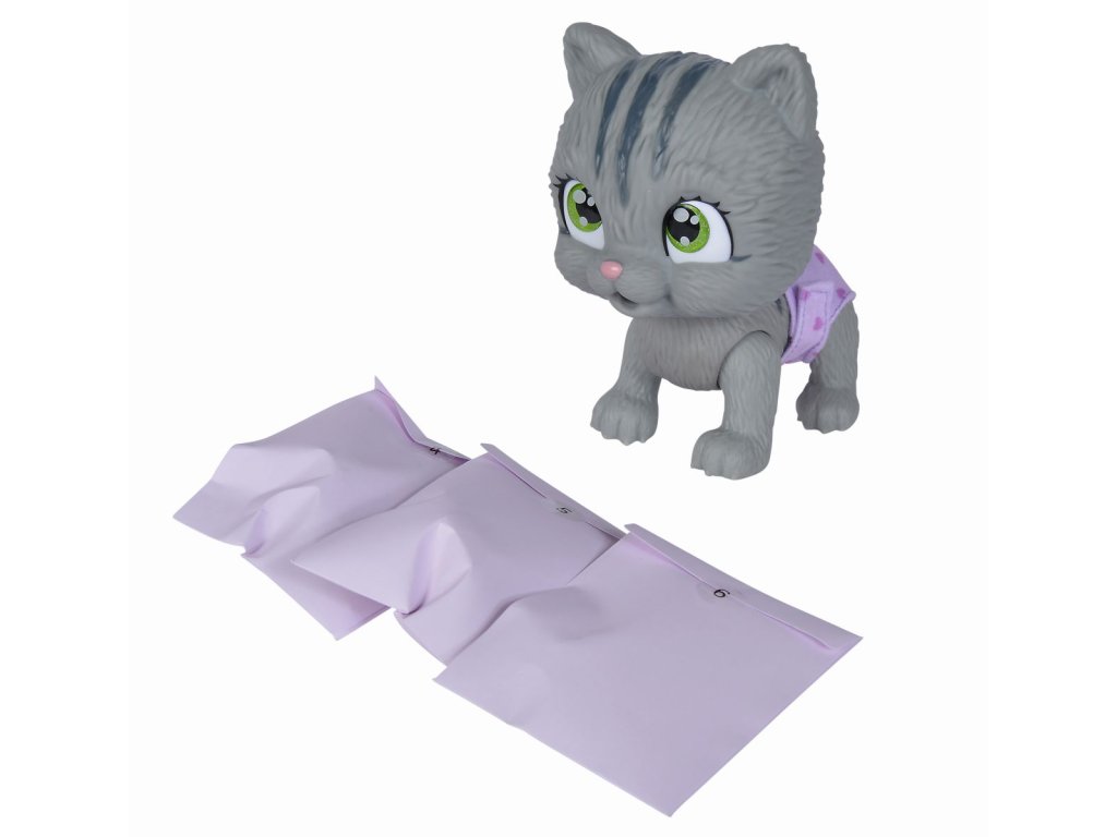 Roztomilé kočičí miminko s picí a čůrací funkcí, plenka s funkcí změny zbarvení po namočení, magická tlapka (po navlhčení se vybarví a ukáže pohlaví koťátka), adopční list a tři překvapení. Velikost 15 cm.