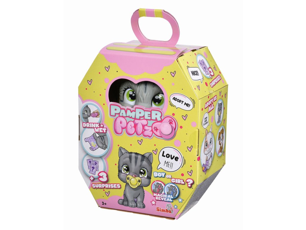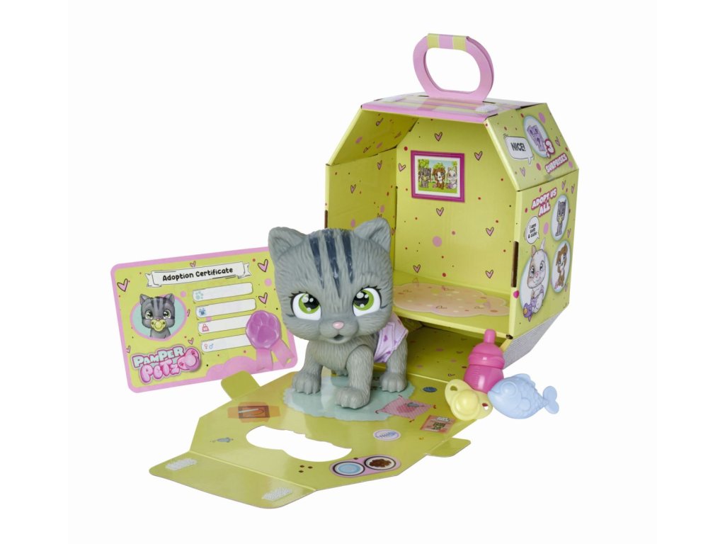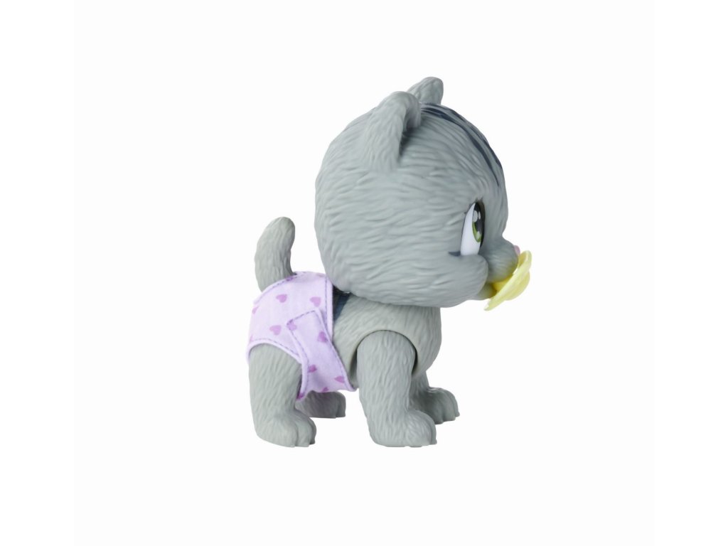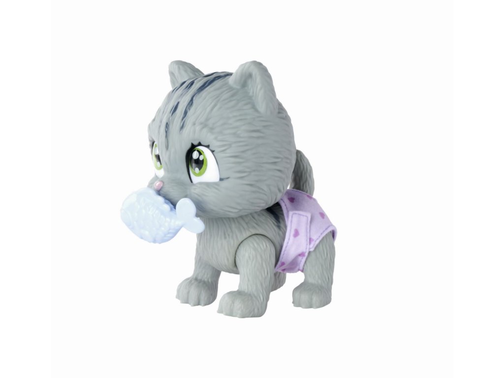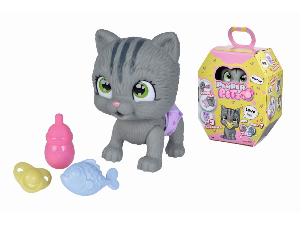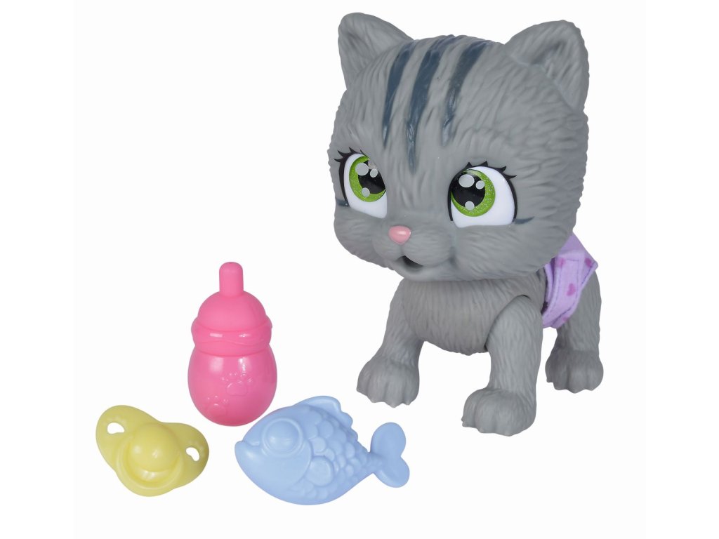 Roztomilé kočičí miminko s picí a čůrací funkcí, plenka s funkcí změny zbarvení po namočení, magická tlapka (po navlhčení se vybarví a ukáže pohlaví koťátka), adopční list a tři překvapení. Velikost 15 cm.