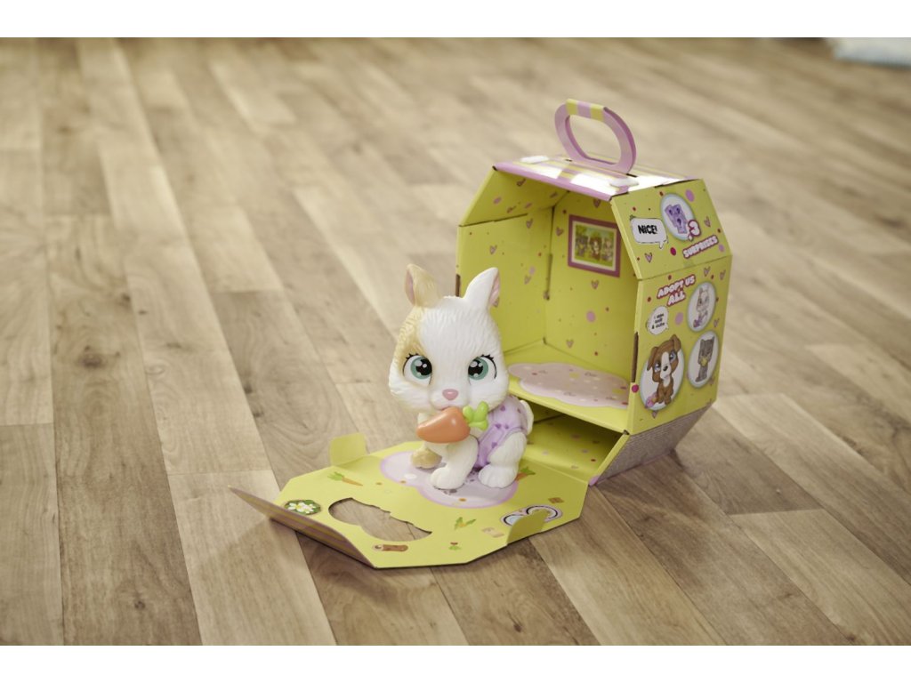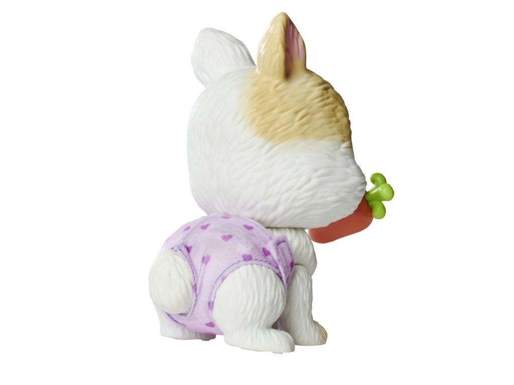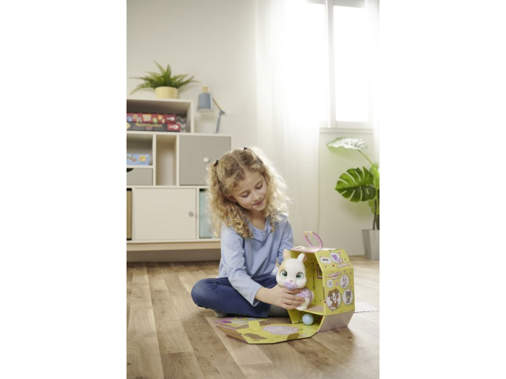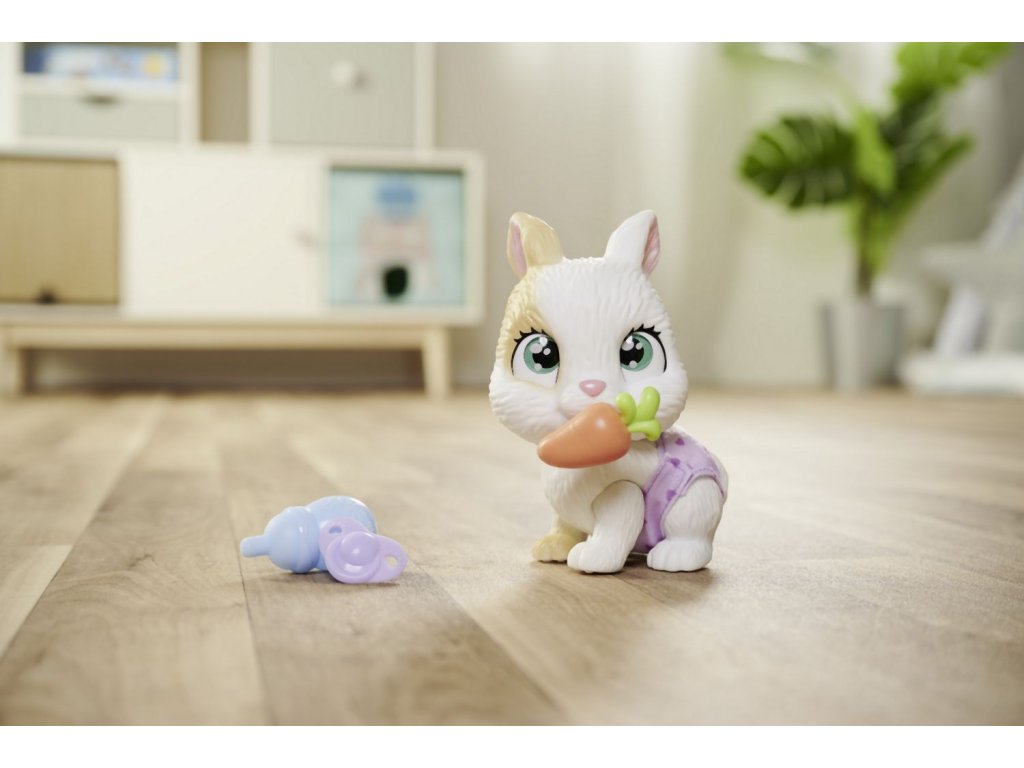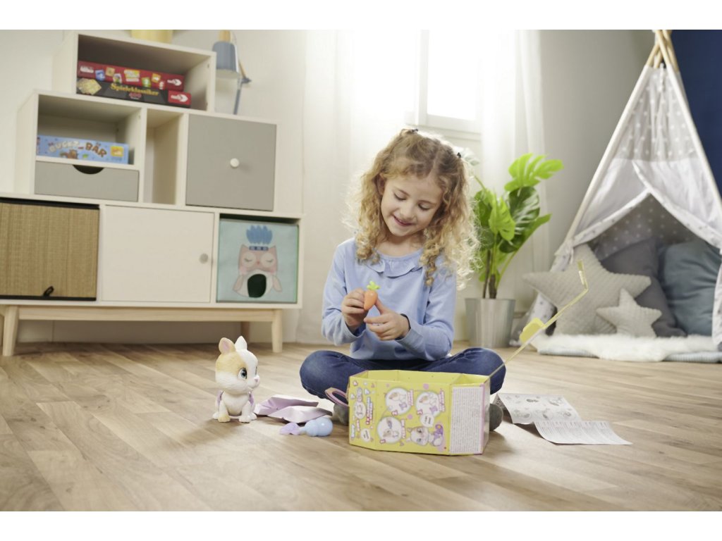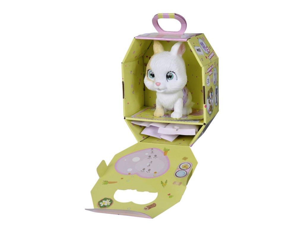 Roztomilé miminko králíčka s picí a čůrací funkcí, plenka s funkcí změny zbarvení po namočení, magická tlapka (po navlhčení se vybarví a ukáže pohlaví králíčka), adopční list a tři překvapení. Velikost 15 cm.
