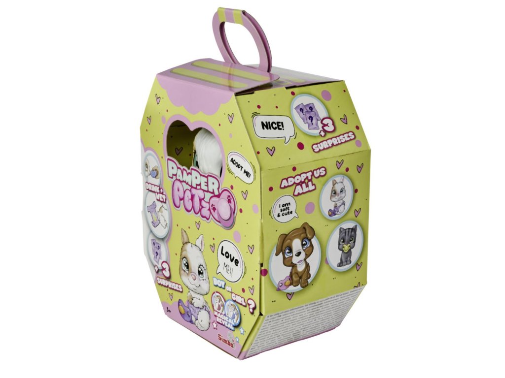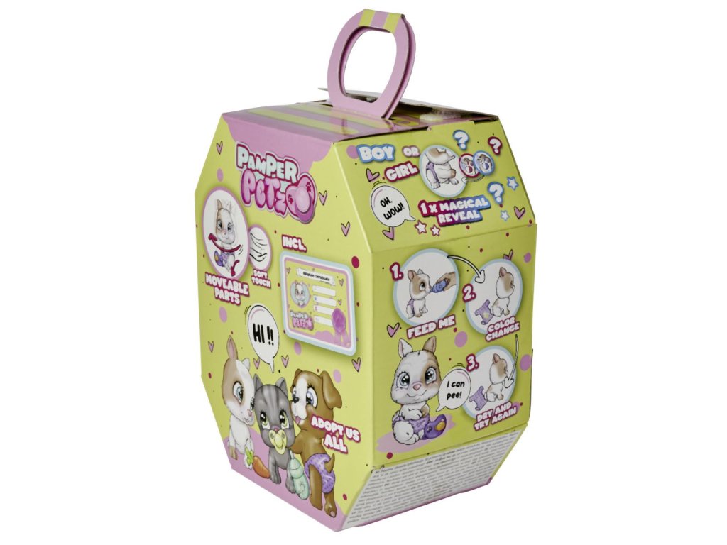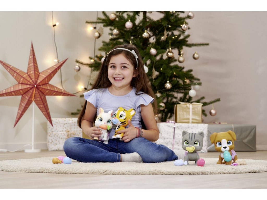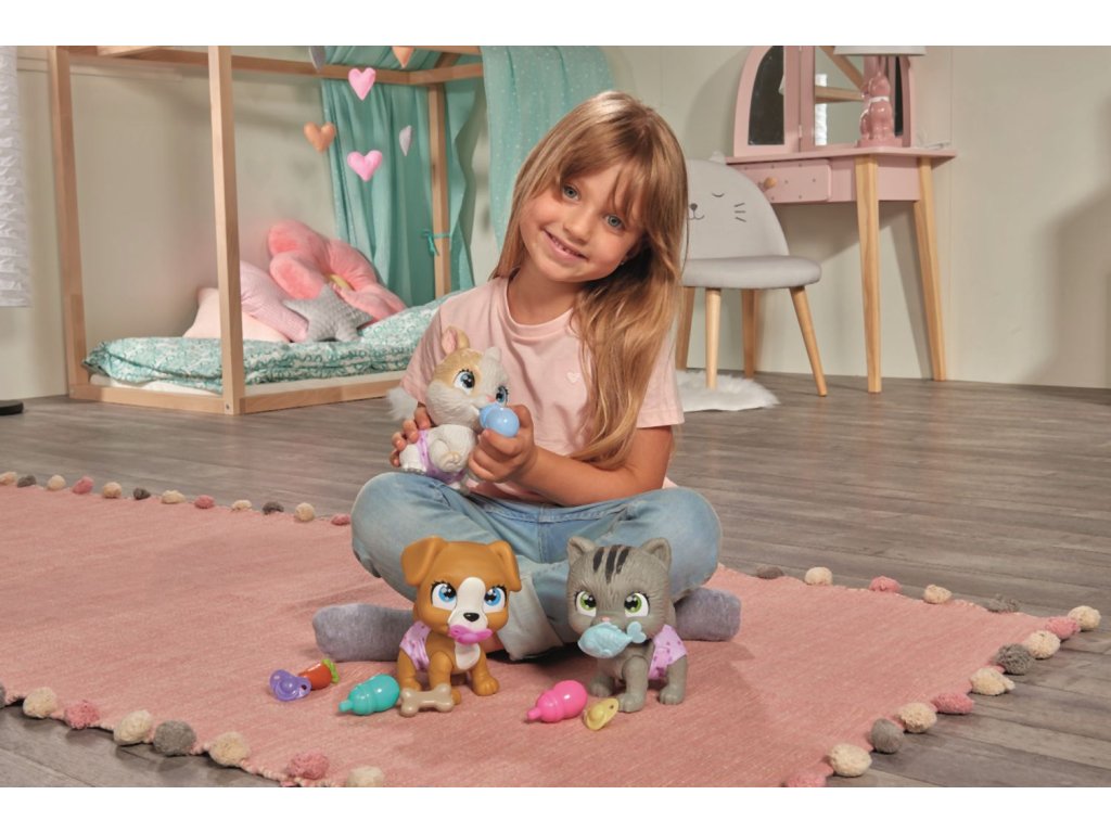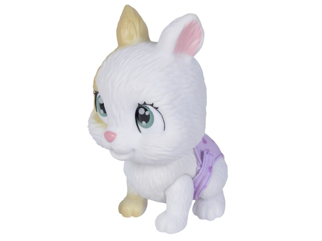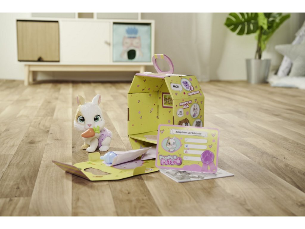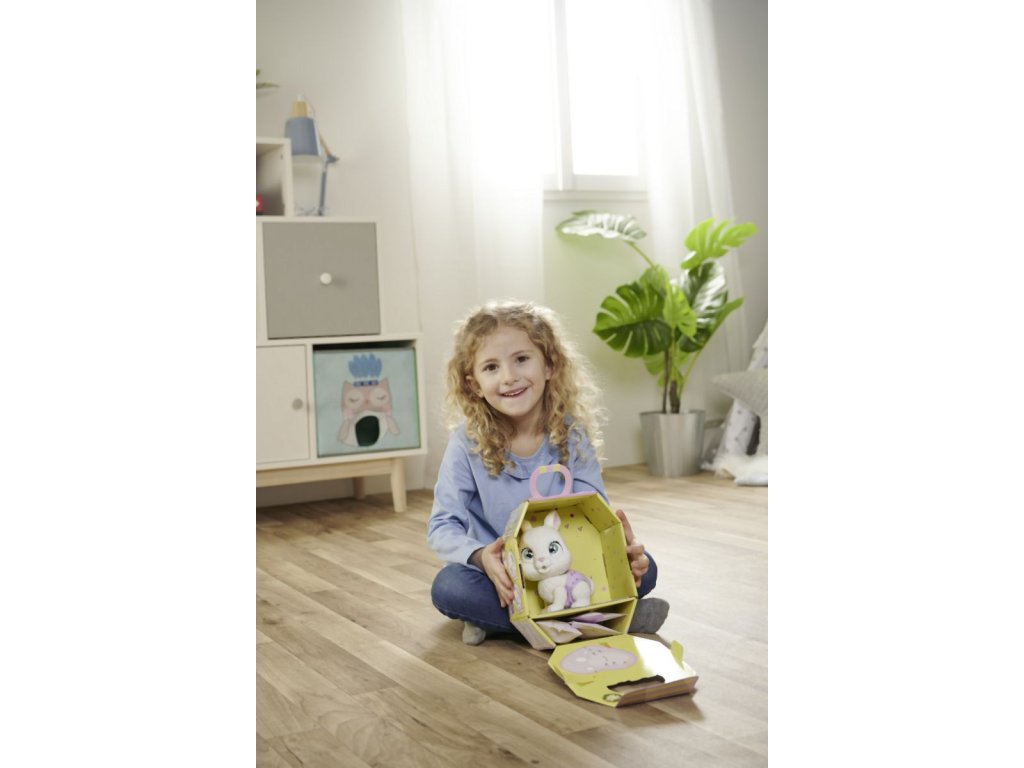 Roztomilé miminko králíčka s picí a čůrací funkcí, plenka s funkcí změny zbarvení po namočení, magická tlapka (po navlhčení se vybarví a ukáže pohlaví králíčka), adopční list a tři překvapení. Velikost 15 cm.