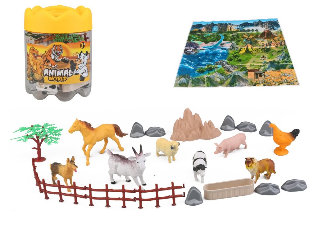 Malá plastová zvířátka, která můžeš vidět na farmě. Zvířátka jsou v přenosném platovém boxu. V balení 25 ks. Balení obsahuje podložka na hraní se zvířátky o velikosti 60x50 cm