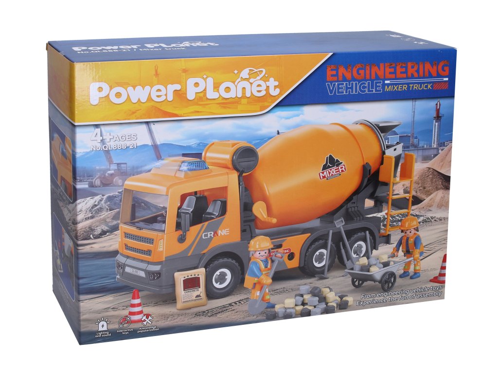 Domíchávač s efekty. Velikost 36 cm. Světelné a zvukové efekty. Obsahuje domíchávač, figurky dělníků, kolečko, náklad, nářadí. 2xAAA baterie nejsou součástí.