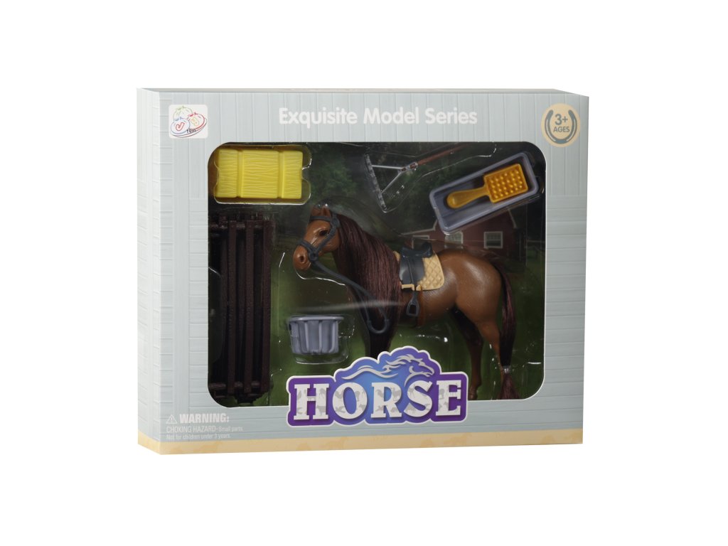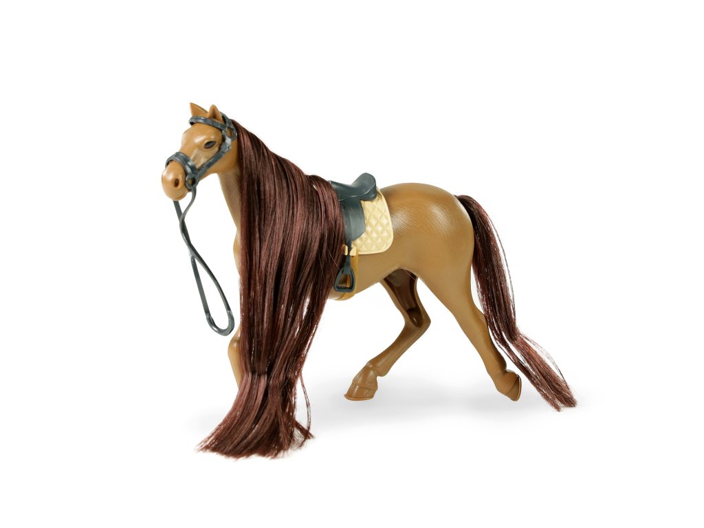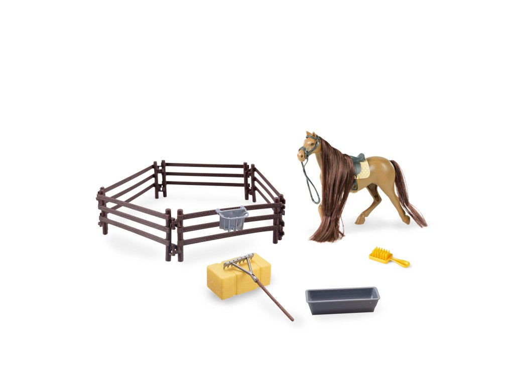 Kůň s tmavou hřívou a sedlem. Koně můžeš česat, a to třeba kartáčem, který najdeš v balení. Velikost koně 14 cm. Součástí je skládací ohrada a příslušenství. Vyrobeno z PVC.