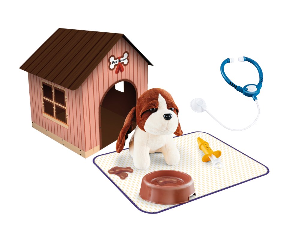 Pejsek s boudou a taštičkou. Velikost pejska 18cm. Balení obsahuje plyšového pejska, tašku s doplňky a boudu ke složení. Návod na krabici. Doplňky: miska, injekce, fonendoskop, pamlsky.