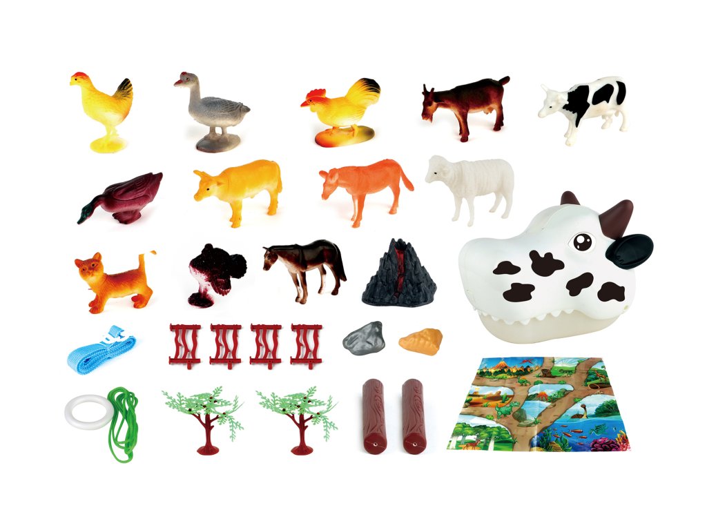 Batoh se zvířátky farma. Rozměry 27x17x19 cm. Součástí zvířátka, stromy a další, hrací mapa, popruh na záda, šňůra s popruhy (lze batoh táhnout), rukojeť v horní části batohu. Návod na instalaci popruhů a šnůry na spodní částí obalu.