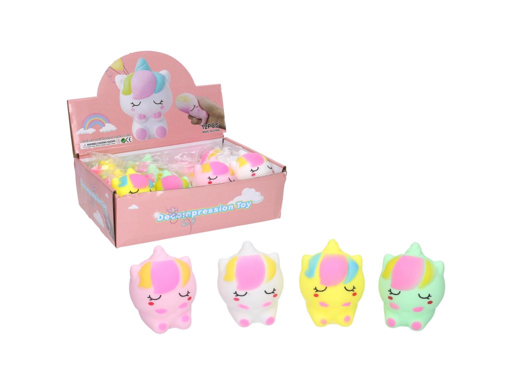 Mačkací jednorožec tvarovací. Velikost 9cm. Display box 12 ks. 4 varianty - růžová, žlutá, bílá, zelená.